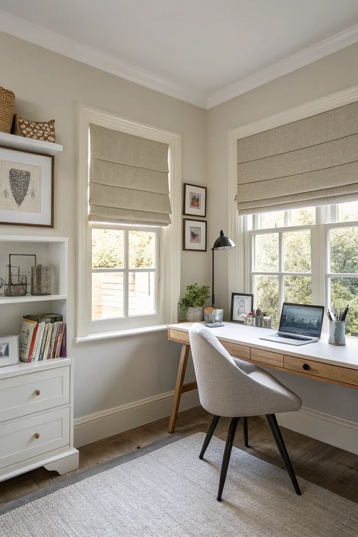 Curtains in a home office should reduce glare while maintaining a professional look.